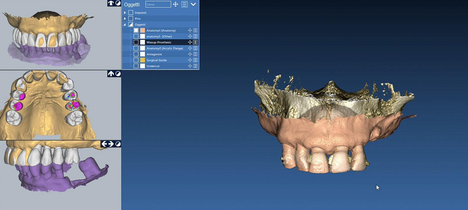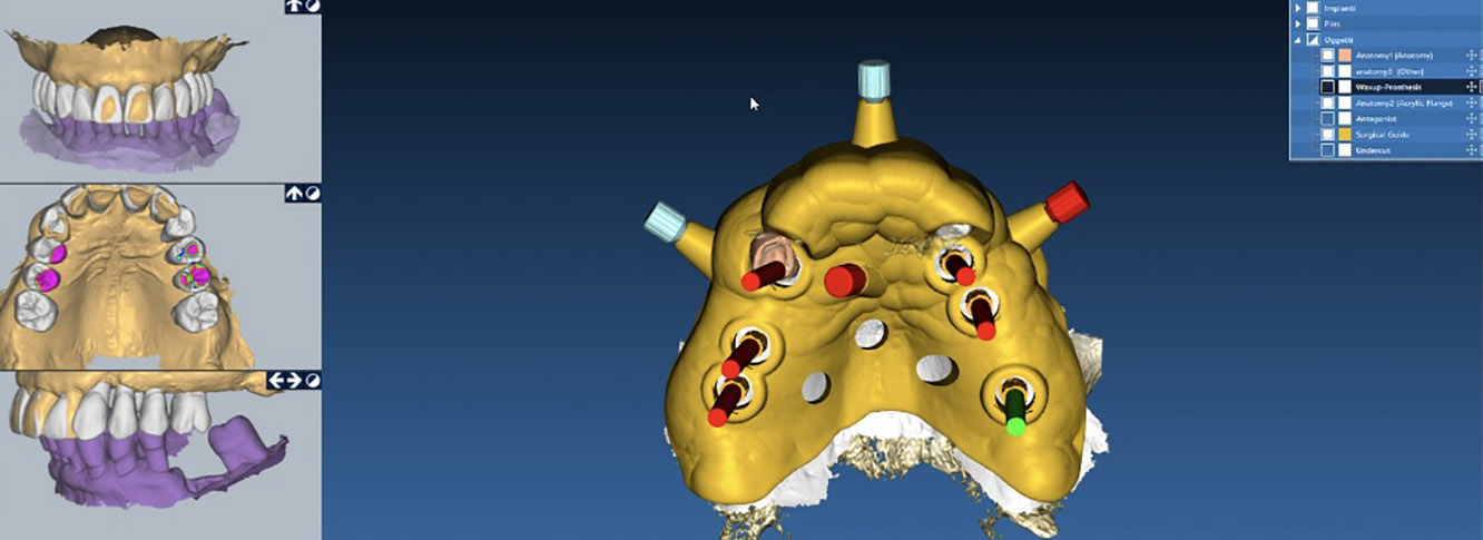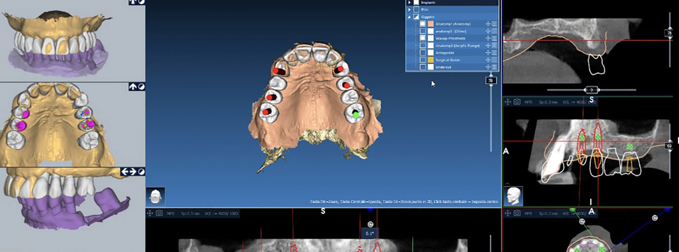 Il sistema permette al clinico di progettare al computer la posizione e la dimensione esatta degli impianti prima dell’intervento chirurgico utilizzando la ricostruzione tridimensionale (3D) di una zona o dell’intera arcata dentale per poi richiedere ad un centro specializzato la costruzione di una guida chirurgica estremamente precisa che permetterà di eseguire un intervento atraumatico.